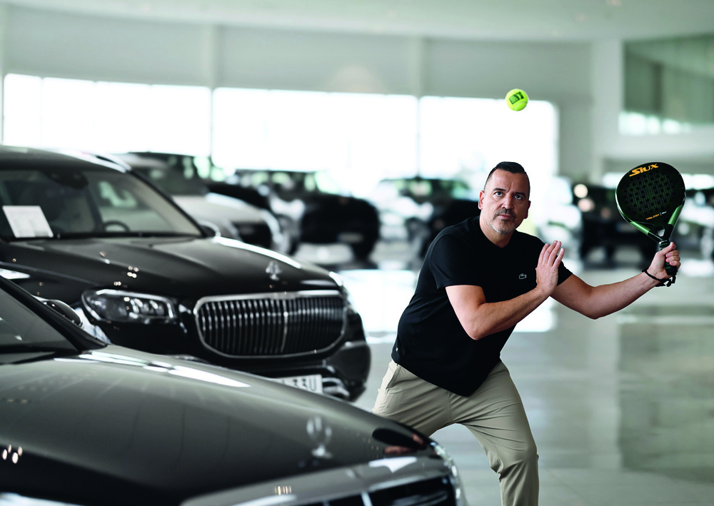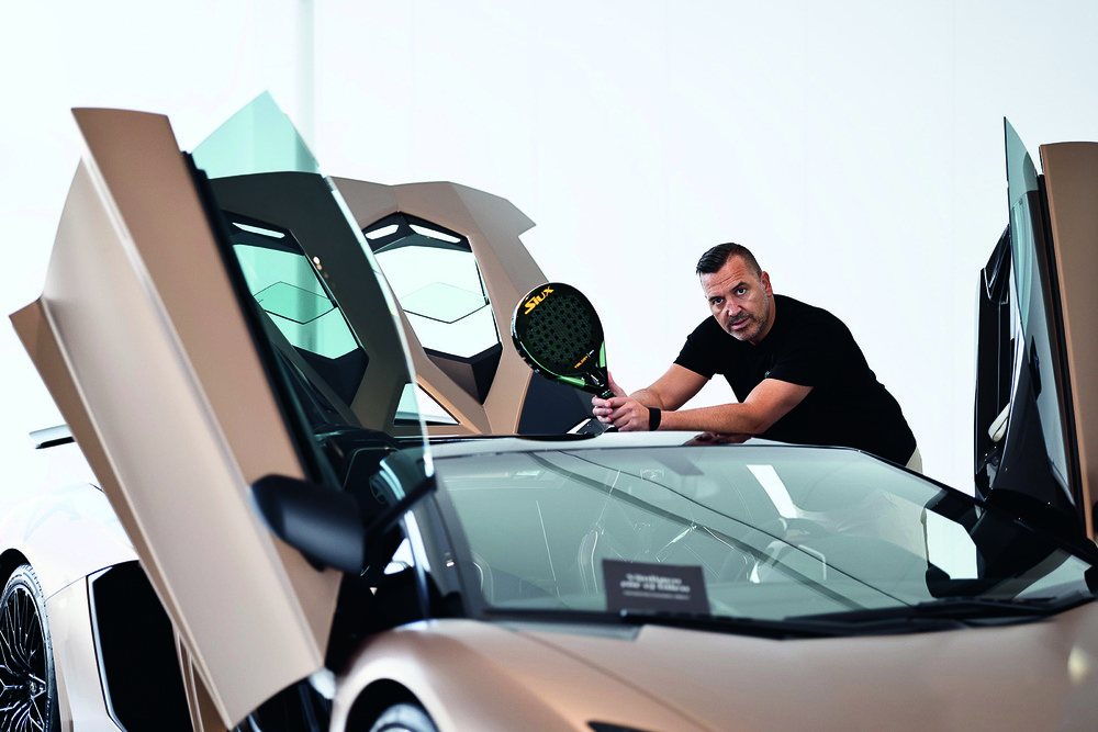 Lyxbilar på rad och ett racket i hand, Sigge Bilajbegovic låter padeln ta lika mycket plats som affärerna. Foto: Peter Holgersson
