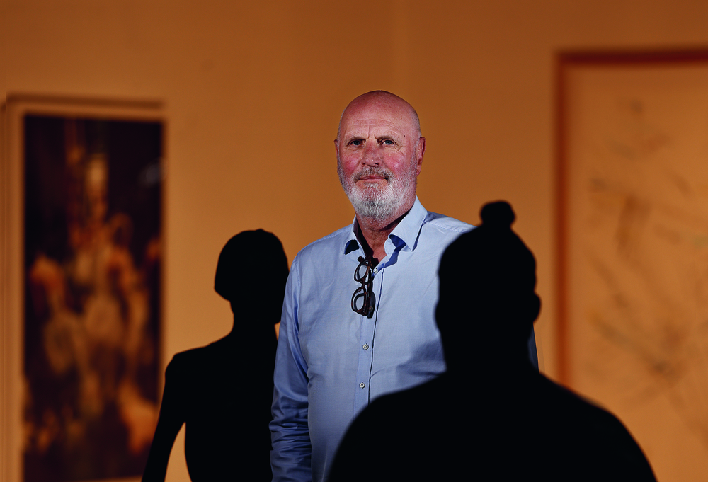Mikael Ståhl i sin konsthall i Yllefabriken – en plats där råa pelare möter samtidskonst och 650 verk samsas utan filter. Foto: Peter Holgersson