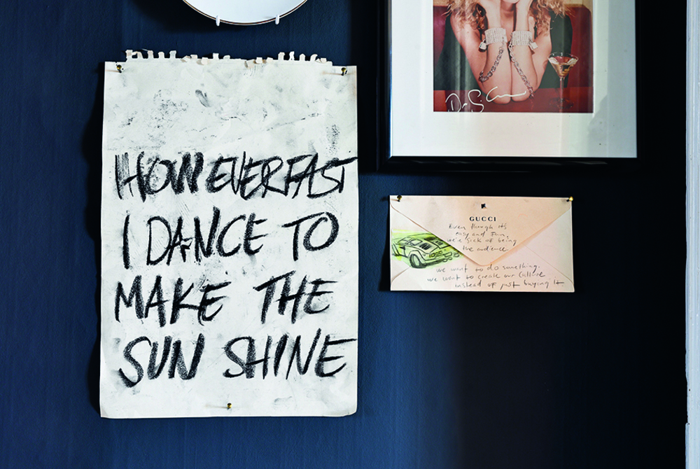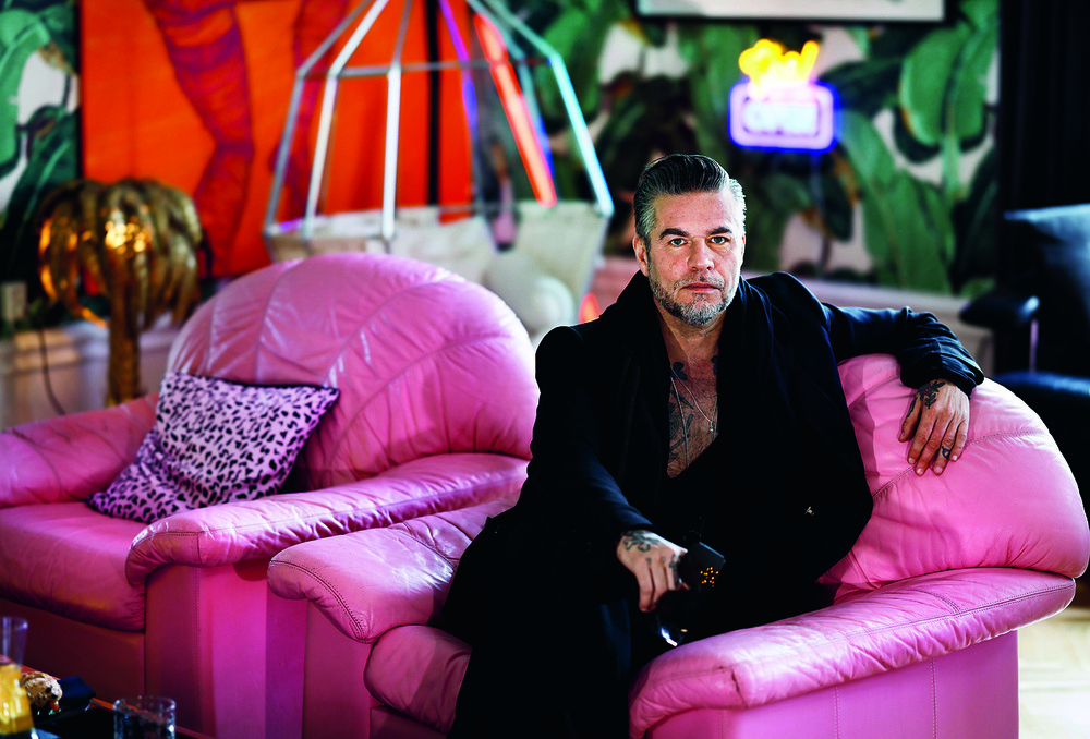 Han lutar sig tillbaka i en låg, skinnfåtölj med leopardmönstrad kudde, som han själv designat och gjort mönstret till. På väggen bakom honom slingrar sig bananblad i tapeten, en neonskylt viskar Yes we are open och ett guldfärgat konstlöv vilar i hörnet. Rummet är som ett skruvat kollage av Pop Art och Palm Springs-glamour men på något vis får han det att fungera – med sin mörka silhuett, tatuerade händer och stilla intensitet mot det nästan absurt lekfulla rummet som fond.